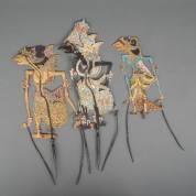 Drie diverse grote polychroom beschilderde wajang koelit poppen, Indonesië, 20e eeuw -gebruikssporen en defecten-, circa 62 cm