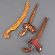 Drie Indonesische krissen, waarvan één in goudkleurige schede, grootste 57 cm lang