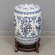 Chinees porseleinen tuinkruk met blauw-wit decor van bloemen, op houten basement -basement met verfverlies-, 46 × Ø 33 cm