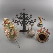 Beschilderd metalen en biscuit bloemboeket, ijzeren vogelhuisje, ijzeren kandelaar in de vorm van een tak, wandluster/kandelaar in de vorm van een hand, en verzilverde Oosterse koffiekan, afmetingen kandelaar 52 × 51 cm -defecten-