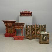Twee Chinese rood- en polychroom geschilderde huisaltaren, de bovenkant en schuine daklijst met open snijwerk, het basement met een laatje, één met deurtjes, en rood geschilderd huisaltaar met plateau voor offerandes, Indiaas beschilderd houten eendeurs kastje en vierslags tafelscherm met voorstellingen met figuren en dieren, 20e eeuw -intensief gebruikt-, grootste altaar 73 × 56 × 23 cm