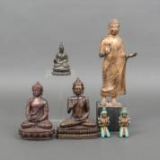 Diverse bronzen Boeddhabeeldjes, grootste 40 cm hoog inclusief houten sokkeltje