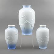 Drie Japans porseleinen vazen, één grote en twee kleinere, met kraanvogeldecor in reliëf, vergulde rand en lichtblauw-witte achtergrond, uitvoering Fukagawa Seiji, Arita, eerste helft 20e eeuw, 37 × Ø 21 en 28 × Ø 16 cm, daarbij: één naaldhouten opbergdoos, 26 × 26 × 41 cm