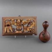 Japans bronzen vaasje met kikkerapplique -drie deuken-, 19 × Ø 10 cm, en Chinees-Indonesisch rood-goudkleurig hardhouten snijwerk, 18 × 33 cm
