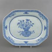 Achthoekige Chinees porseleinen schotel met blauw-wit bloemenvaasdecor en vlinders op de rand, Qianlong/Jiaqing -kleine glazuurschilfertjes van rand, gebruikssporen-, 33 × 41 cm