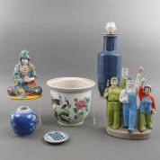 Divers Chinees porselein: cache-pot met famille rose bovenglazuur decor: pauwen, zittende Guanyin -defecten-, blauwe lampvoet -gelijmd-, potje met bloesemdecor, losse deksel, en beeldgroep: twee arbeiders en een soldaat -ornament, vermoedelijk sikkel, afgebroken-, alle 20e eeuw, afmetingen beeldgroep 25 × 23 × 13 cm