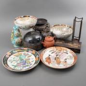 Diverse Aziatica, waaronder: champlevé, Japans porselein, turquoise vaas -kleine defecten-, en houten standaard
