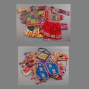 Traditionele geborduurde katoenen dameskleding, voornamelijk lijfjes, kinderkleding, tasjes, mutsjes, etc., versierd met spiegeltjes en kralen, Gujarat, India, 20e eeuw, 50 cm