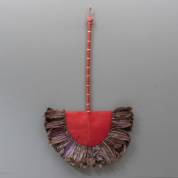 Met rode stof omwonden waaier met een verentooi, vermoedelijk Amerikaans inheems, 113 × 64 cm