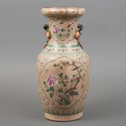 Gecraqueleerde Chinees porseleinen vaas met famille rose decor van bloemen en vogels in cartouches, Kanton, 19e eeuw -hals gelijmd-, 43 × Ø 19 cm
