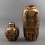 Twee bronskleurige porseleinen vazen: één dekselvaas, 31 × Ø 25 cm, en één hoge open vaas, 60 × Ø 30 cm, China, modern