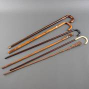 Zes diverse wandelstokken, waaronder: paraplu met inschuifbare houten huls, en een exemplaar met een uilenkopje -één oogje ontbreekt-