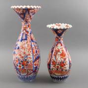 Twee Japans porseleinen Imari plooivazen met floraal decor, 19e/20e eeuw -beide met gerestaureerde breuken aan hals-, grootste 55 × Ø 18 cm
