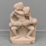Zandstenen beeld: intieme omhelzing, een associatie met de Panchamakara of de vier M's van de Tantra -rechtsvoor is een hoekje afgebroken van het basement, kleine defecten-, 52 × 35 × 12 cm