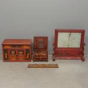 Chinese roodgeschilderde houten kaptafelspiegel, bruingeschilderd stoeltje met laatjes in het basement en opengewerkte rugleuning, Indiaas roodgeschilderd houten kastje, de laatjes met polychroom bloemdecor, en gestoken houten wandreliëf met polychrome religieuze figuren, 20e eeuw -gebruikssporen-, spiegel 69 × 69 × 23,5 cm