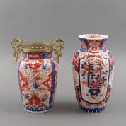 Japanse Imari vaas met messing montuur en twee grepen gevormd als drakenkoppen, en Japanse Imari vaas met floraal decor, 19e/20e eeuw, hoogste 29,5 × 15 cm