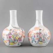 Paar Chinees porseleinen steelvazen met famille rose decor van Shou Lao, vergezeld door een dame en twee jongens, 20e eeuw, hoogte 33 cm