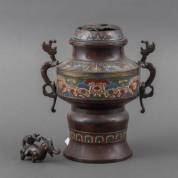 Chinese bronzen champlevé wierookbrander, op het deksel een fabeldier -fabeldier afgebroken en defect, wel bijgevoegd-, hoogte exclusief fabeldier 28 cm