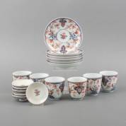 Zes porseleinen Imari kommen naar Chinees voorbeeld, Chinees porseleinen Imari kom, Chinees porseleinen capucijner kommetje en drie schoteltjes, famille rose kommetje en een famille rose schoteltje -defecten-, grootste kom 5,5 × Ø 11 cm