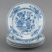 Vijf Chinees porseleinen borden met blauw-wit decor van bloemenvazen, Qianlong -defecten-, Ø 23,5 cm