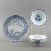 Japans porseleinen bord met blauw-wit drakendecor, gemerkt, 19e eeuw, Ø 27 cm, Chinees porseleinen kom met blauw-wit floraal decor, Guangxu gemerkt en periode -gelijmd, randchips-, Ø 17 cm, en Chinees porseleinen kom op voet met blauw-wit decor, 19e eeuw -randschade-