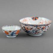 Grote Chinees porseleinen kastkom met decor van bloemen en kostbaarheden, 18e eeuw -doormidden geweest en gelijmd-, 11 × 25,5 cm, daarbij: Chinees porseleinen Imari kom met bloemdecor, 18e eeuw -haarlijnen-, 6,5 × Ø 14,5 cm