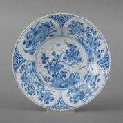 Chinees porseleinen diep bord met blauw-wit decor van diverse planten en kostbaarheden, gemerkt met artemisiablad, Kangxi -haarlijnen-, Ø 22 cm