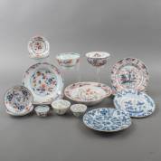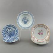 Divers Chinees porselein: scheerbekken, zes borden, drie kommen, zes schoteltjes, daarbij twee Japans eierschaal bedekte kopjes -meerdere borden en scheerbekken gelijmd, defecten-, scheerbekken Ø 26,5 cm