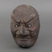 Gelakt Japans houten masker met een grote neus, aan binnenzijde een beschreven papieren label -gebruikssporen-, 30 × 18 cm
