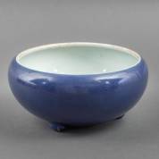 Chinees porseleinen poudre bleu wierookvat, staande op drie kleine pootjes, 19e eeuw -bakfoutje in één van de pootjes-, 12,5 × Ø 26 cm