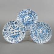 Paar Chinees porseleinen borden met blauw-wit decor in Wanli-stijl, gemerkt met dubbele ruit, 18e eeuw -randbeschadigingen, haarlijnen-, Ø 21 cm, en een los bord met blauw-wit decor in Wanli-stijl, gemerkt, 18e eeuw -gekramd-, Ø 22 cm