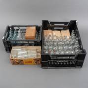 Grote verzameling glazen apothekersflesjes, diverse afmetingen en uitvoeringen, daarbij: doosjes met kurken met afsluitbare druppelaars, herkomst: Drogisterij Woortman, Utrecht