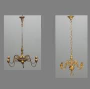 Zeslichts messing bolkroon, 19e/20e eeuw, 104 × Ø 50 cm inclusief ophanging, daarbij: geëlektrificeerde zeslichts plafondlamp -lak sleets-, 94 × Ø 66 cm