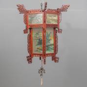 Chinese houten hanglamp, de ruitjes van beschilderd glas, waaraan een bel in de vorm van een tempel, tweede helft 20e eeuw -één ruitje ontbreekt-, 67 × 62 cm