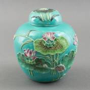 Turquoise Chinees porseleinen gemberpot met reliëfdecor van een lotusvijver, 20e eeuw, hoogte 19 cm