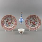 Vier stuks porselein: kommetje met polychroom figurendecor en inscripties, Daoguang gemerkt en periode -haarlijn en randchipje-, 5,5 × Ø 9 cm, blauw-wit Chinees puntvaasje met bloemdecor, Kangxi -stuk van hals afgebroken-, 17,5 cm, en paar famille rose borden met bloemdecor, uitvoering Samson -één met randchipje-, Ø 24 cm
