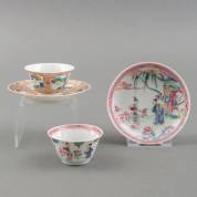 Twee Chinees porseleinen famille rose kommetjes en schoteltjes, de een met figurendecor bij tuinpaviljoen -defecten-, de ander met decor van figuur in landschap -kommetje met haarlijn-, beide 18e eeuw, grootste schoteltje Ø 10,5 cm