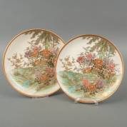 Twee Japanse Satsuma schotels met decor van fazanten, gemerkt Kagaya, Kobe, 20e eeuw, Ø 31 cm