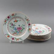 Serie van zes Chinees porseleinen famille rose borden met florale decors, Qianlong -defecten, één bord gerestaureerd-, Ø 23 cm