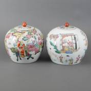Paar Chinees porseleinen famille rose dekselpotten met figurendecors, 20e eeuw, 22,5 × Ø 21 cm