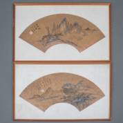 Paar Chinese waaierontwerpen: goudgespikkeld berglandschap, met inscripties en zegelmerken, 53 cm breed