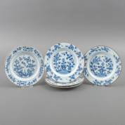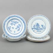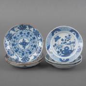 Serie van zes Chinees porseleinen schoteltjes met blauw-wit floraal decor, Qianlong -defecten, één gelijmd-, Ø 14 cm