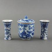 Chinees porseleinen dekselpotje en twee kastvaasjes met blauw-wit floraal decor, 18e eeuw -twee randchipjes-, dekselpotje 12 cm hoog