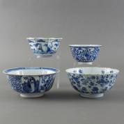 Drie Chinees porseleinen kommen en een Japanse kom met blauw-witte decors, 17e-19e eeuw -defecten-, grootste Ø 16 cm