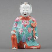 Chinees porseleinen famille rose beeld van zittende jongen met perzik en ruyi-scepter, 19e eeuw -chipjes-, 16 × 10 × 6 cm