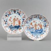 Paar Chinees porseleinen Imari borden met decor van twee lange lijzen, de rand met bloemen en kostbaarheden, Kangxi -beide met haarlijn, één met randrestauratie-, Ø 22 cm
