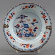 Chinees porseleinen Imari bord met bloemdecor en later 2e gehalte zilveren hengsel afgezet met parelrand, 18e eeuw -randschilfer en scheurtje in hengsel-, Ø 23 cm