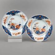 Paar Chinees porseleinen Imari borden met floraal decor, 18e eeuw -één met haarlijn, één met randchips-, Ø 23 cm