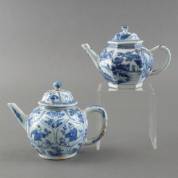 Twee diverse Chinees porseleinen theepotten met blauw-witte decors, Kangxi -defecten-, hoogste 11,5 cm