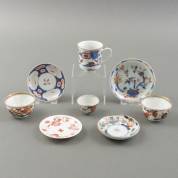 Vier Chinees porseleinen Imari kommetjes en vijf schoteltjes, drie Chinees porseleinen kommetjes met Amsterdams bont decor, twee diverse Chinees porseleinen Imari kommetjes, Chinees porseleinen Imari kopje met oor, alle 18e eeuw -vele defecten en gelijmde exemplaren-, grootste kommetje 4 × Ø 7 cm